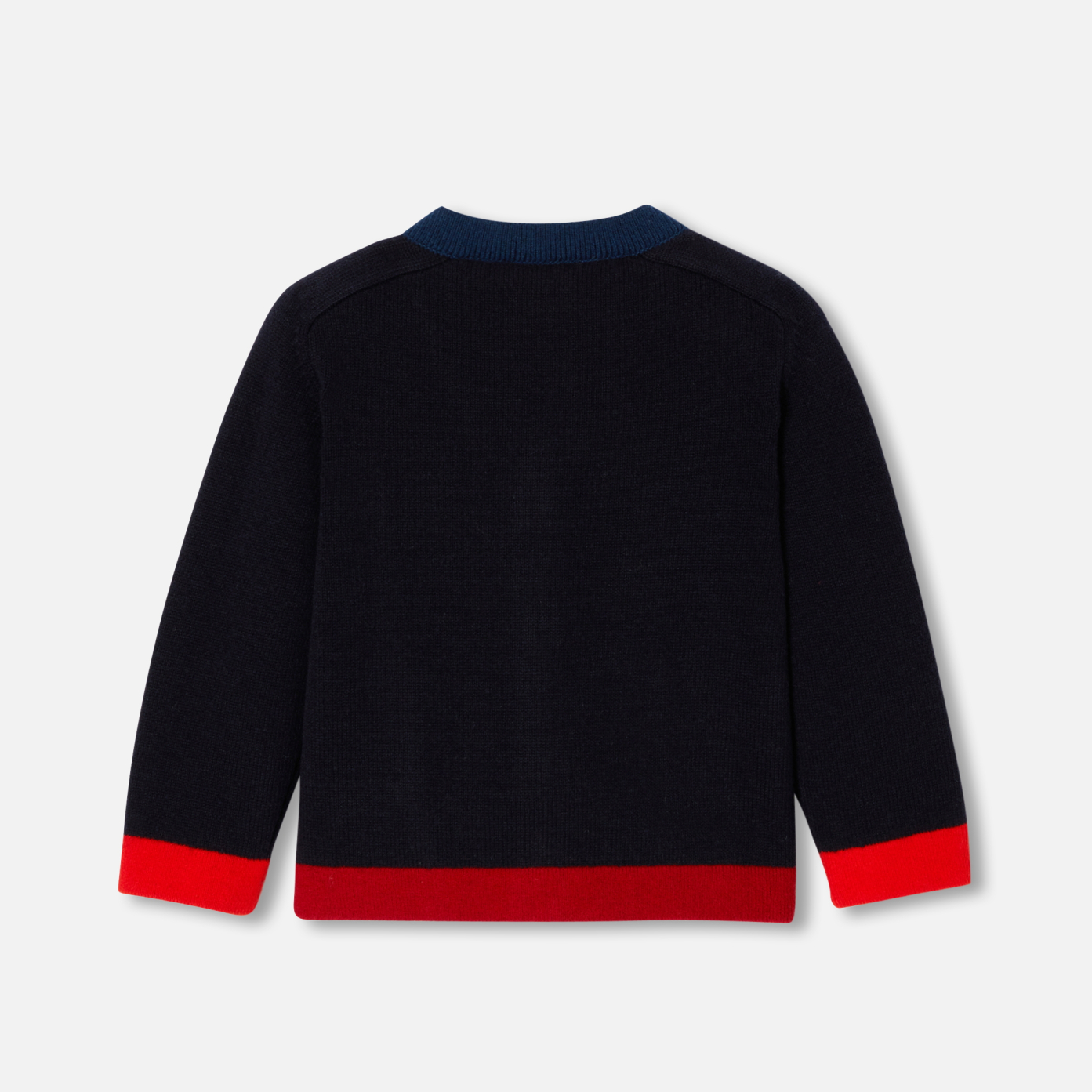 Le gilet bébé garçon fait rayonner le chic français. Confectionné en laine responsable et cachemire, encolure, bas de manches et poches contrastés modernisent ce modèle prêt à porter sur une marinière avec un jean retroussé pour un look contemporain.- Gilet bébé en laine responsable et cachemire- Encolure, bas de manches et poches contrastés- Badge baleine sur poitrine- Poches plaquées en base- Ouverture boutonnée