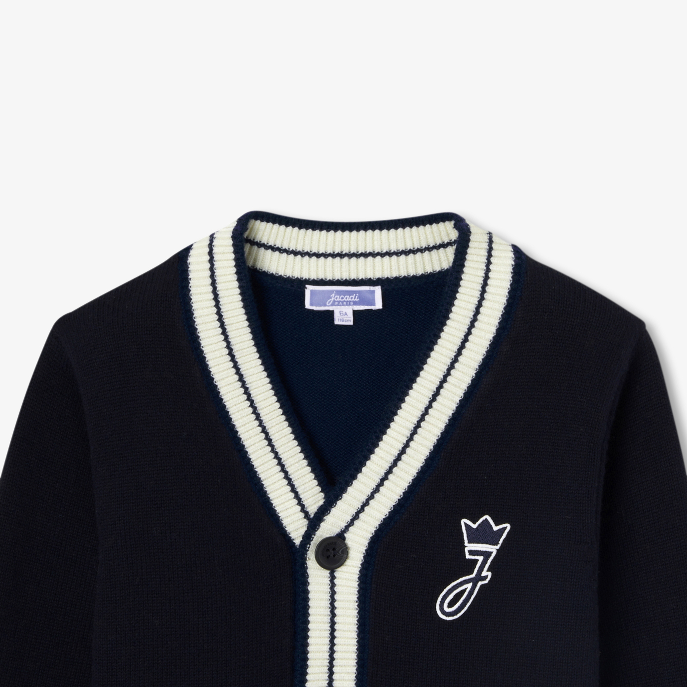Preppy chic et graphique, le classique cardigan enfant garçon gagne en modernité avec ses empiècements en bord-côte rayé. En coton biologique et laine responsable, les petits citadins adopteront immédiatement son look color block. Un incontournable à porter avec un t-shirt et un pantalon en velours pour une silhouette citadine.- Gilet enfant garçon en coton biologique et laine responsable- Encolure, bas de manches et poignets en bord-côte rayé- J brodé sur poitrine- Ouverture boutonnée