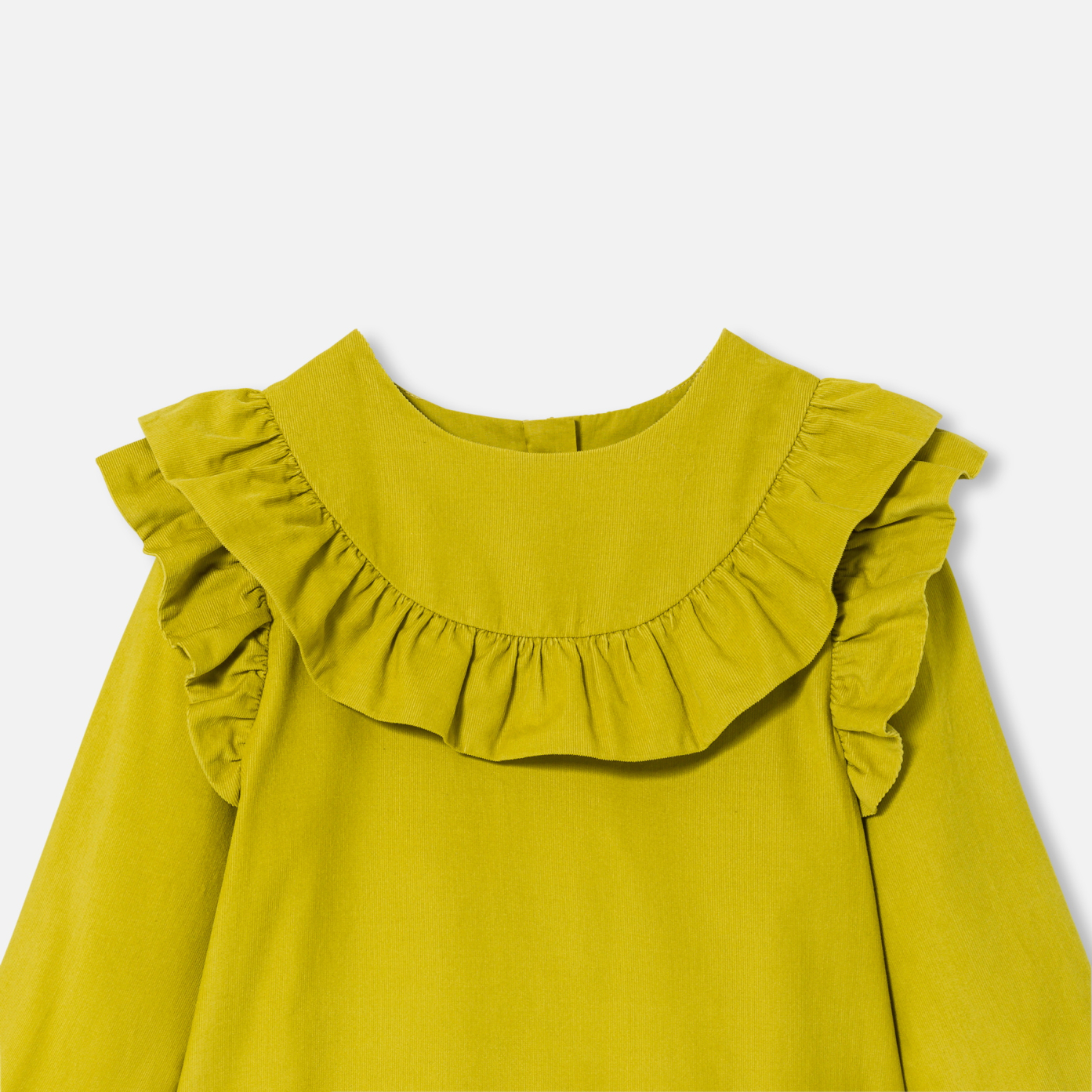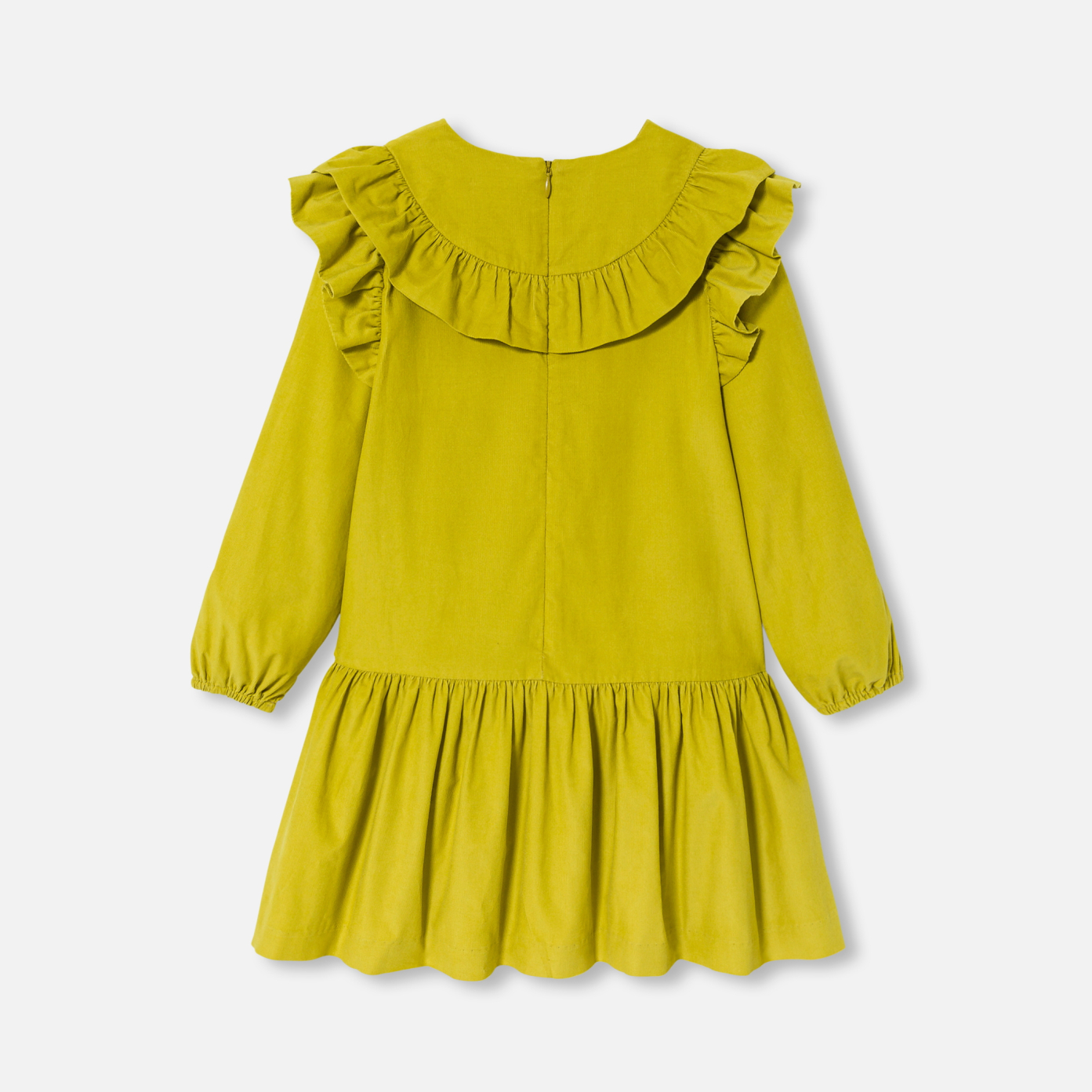 Une robe à l'élégance rétro modernisée d'un coloris dans l'air du temps pour l'automne. En velours milleraies doublé en coton, plastron et base volantés dynamisent cette pièce au charme français. Portée sous un manteau en laine avec des salomés, offrez-la dès maintenant.- Velours milleraies- Plastron volanté- Bas de manches élastiqués- Base volantée- Doublure en coton- Ouverture par zip invisible au dos
