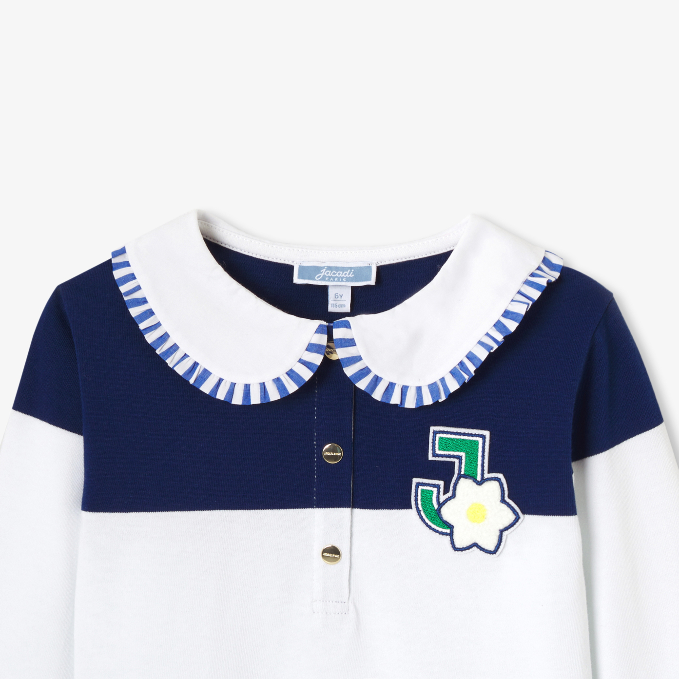 Revu et stylisé pour les petites filles d'aujourd'hui, le polo fait une arrivée remarquée dans le vestiaire quotidien. Féminisé d'un col Claudine bordé d'un ruché, larges rayures pour un look color block et badge J et fleur brodé dynamisent ce tout nouveau modèle à accorder à un jean large et des salomés pour une silhouette collège preppy ultra-contemporaine.- Polo enfant fille- Jersey de coton biologique- Col Claudine en popeline à détail ruché- Patte pressionnée à l'encolure- Badge brodé J et fleur sur poitrine