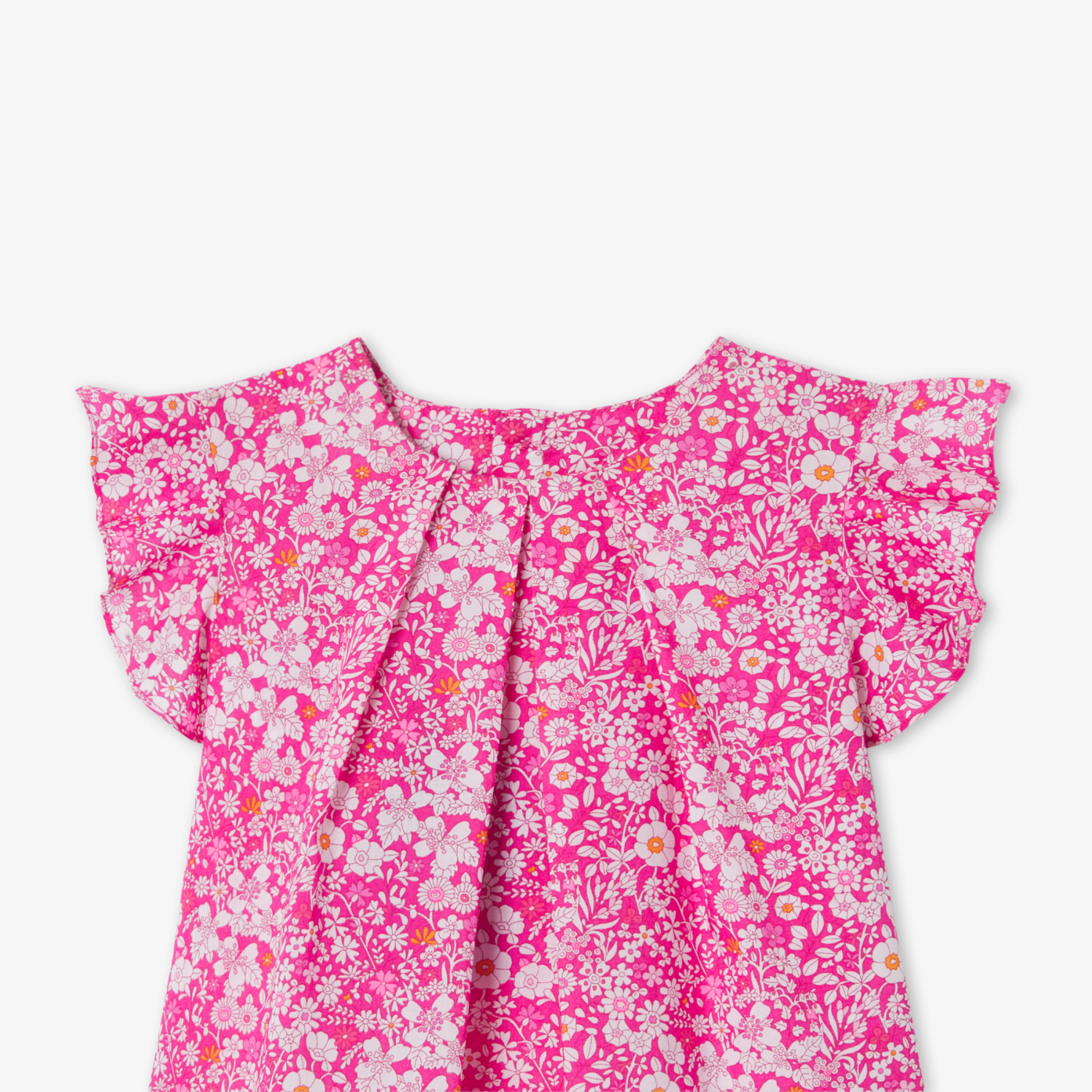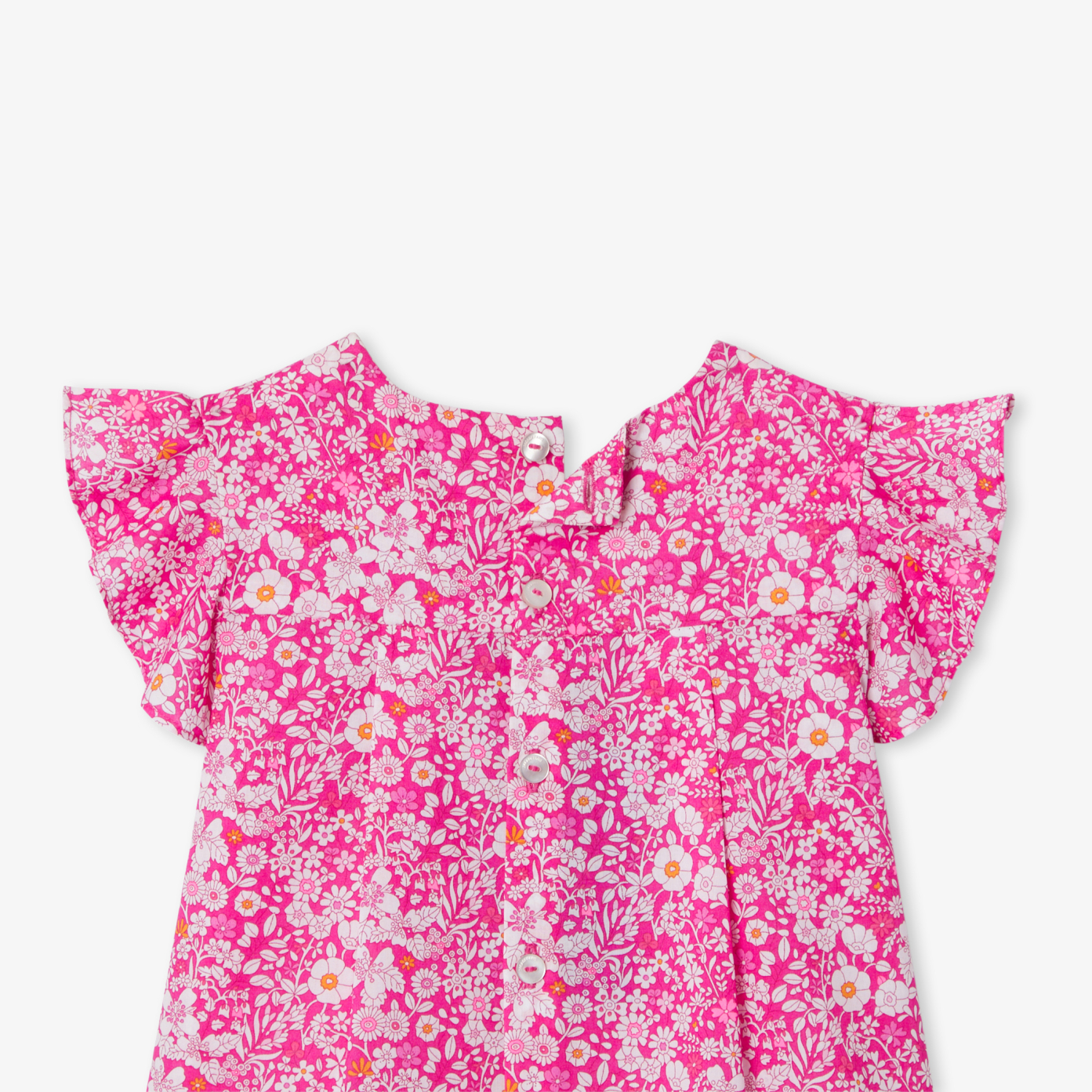 A floral and colourful season with this baby girl blouse. Liberty fabric, ruffled sleeves and pleats at the neckline for a pretty volume structure this blouse with spring charm to match with shorts and sandals for everyday wear.-Baby girl blouse with short sleeves-Ruffled neckline-Buttoned opening at back-Liberty June's Meadow fabric, exclusive Jacadi colouring.