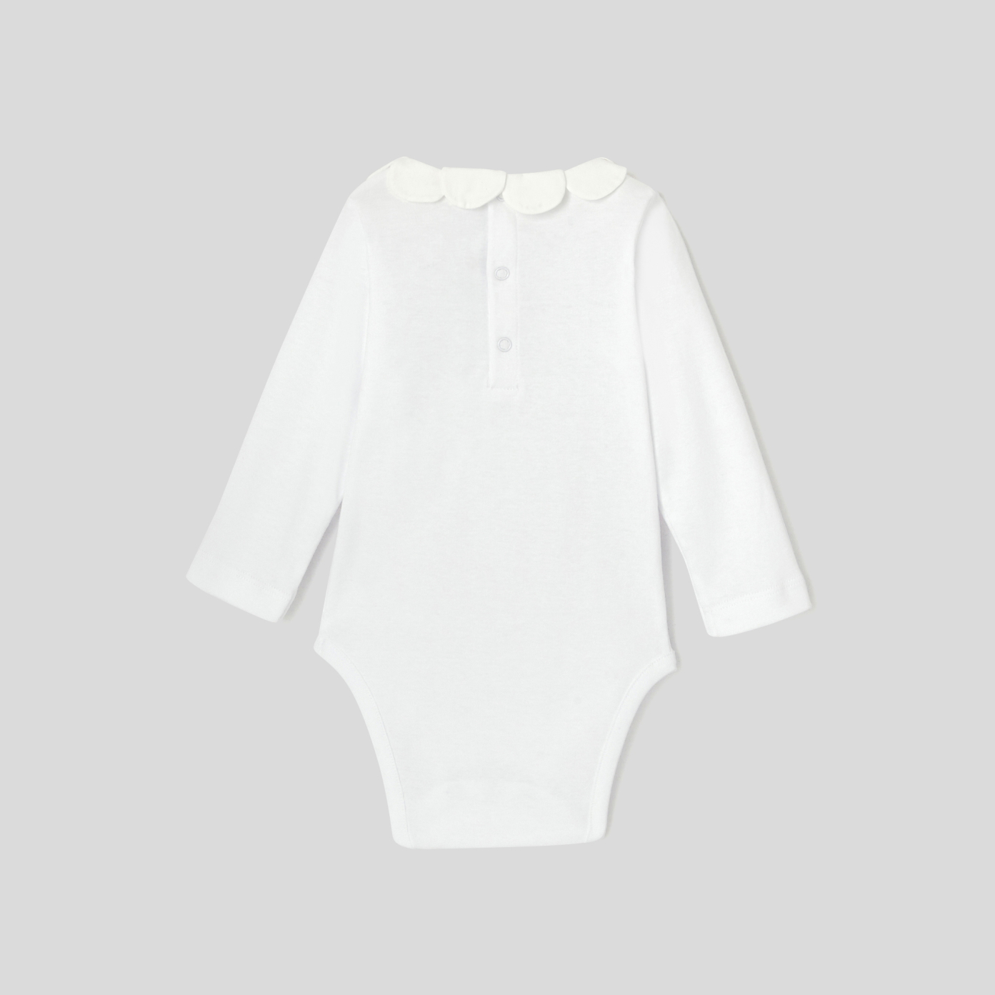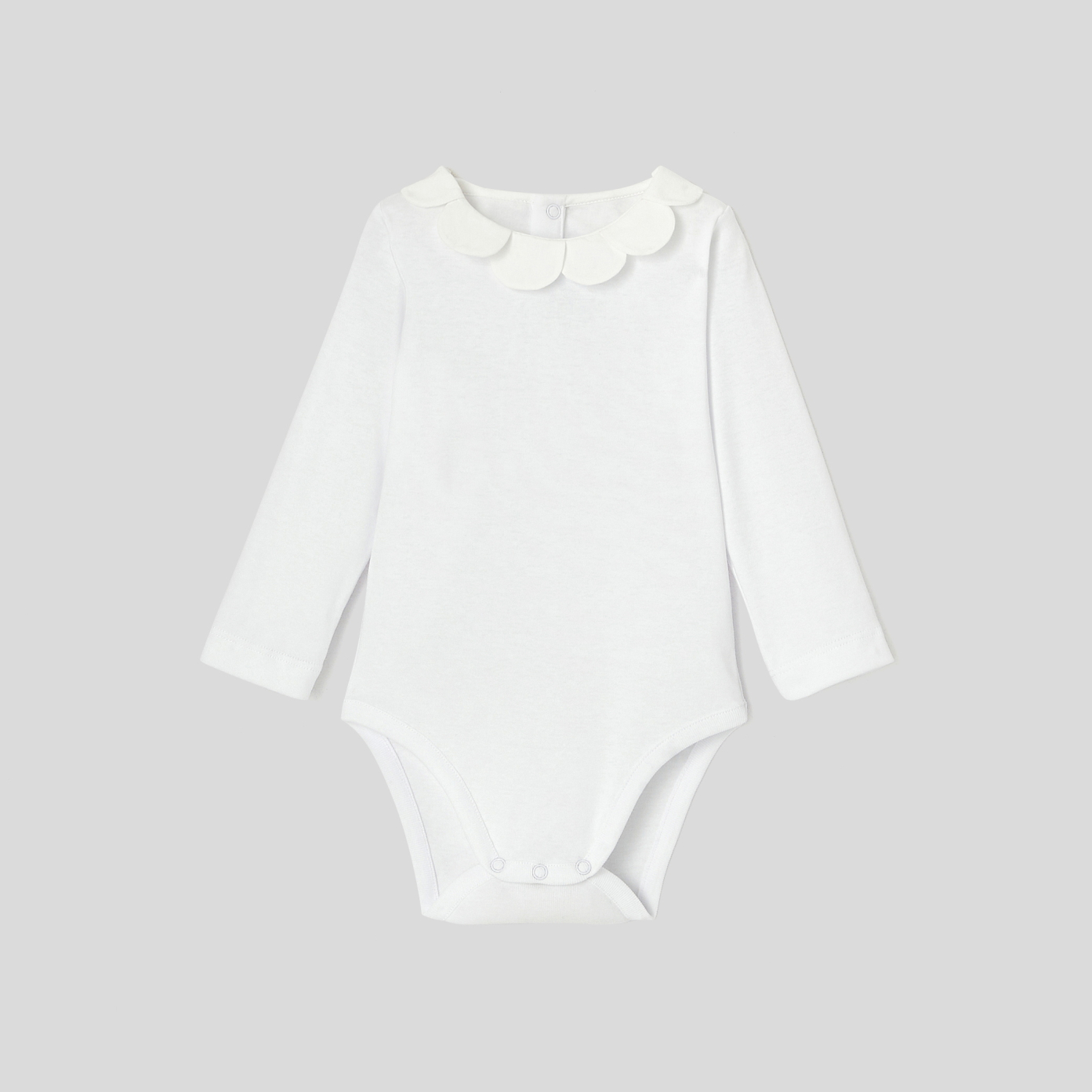 This must-have organic cotton bodysuit distinguishes itself with an absolutely delightful petal collar specially created by Jacadi to elevate little girls' outfits. Easy to slip on thanks to a snap button closure at the back and between the legs, this bodysuit from the Essentiels collection would be lovely paired with a cardigan and footed leggings from the Jacadi Little Knits collection.