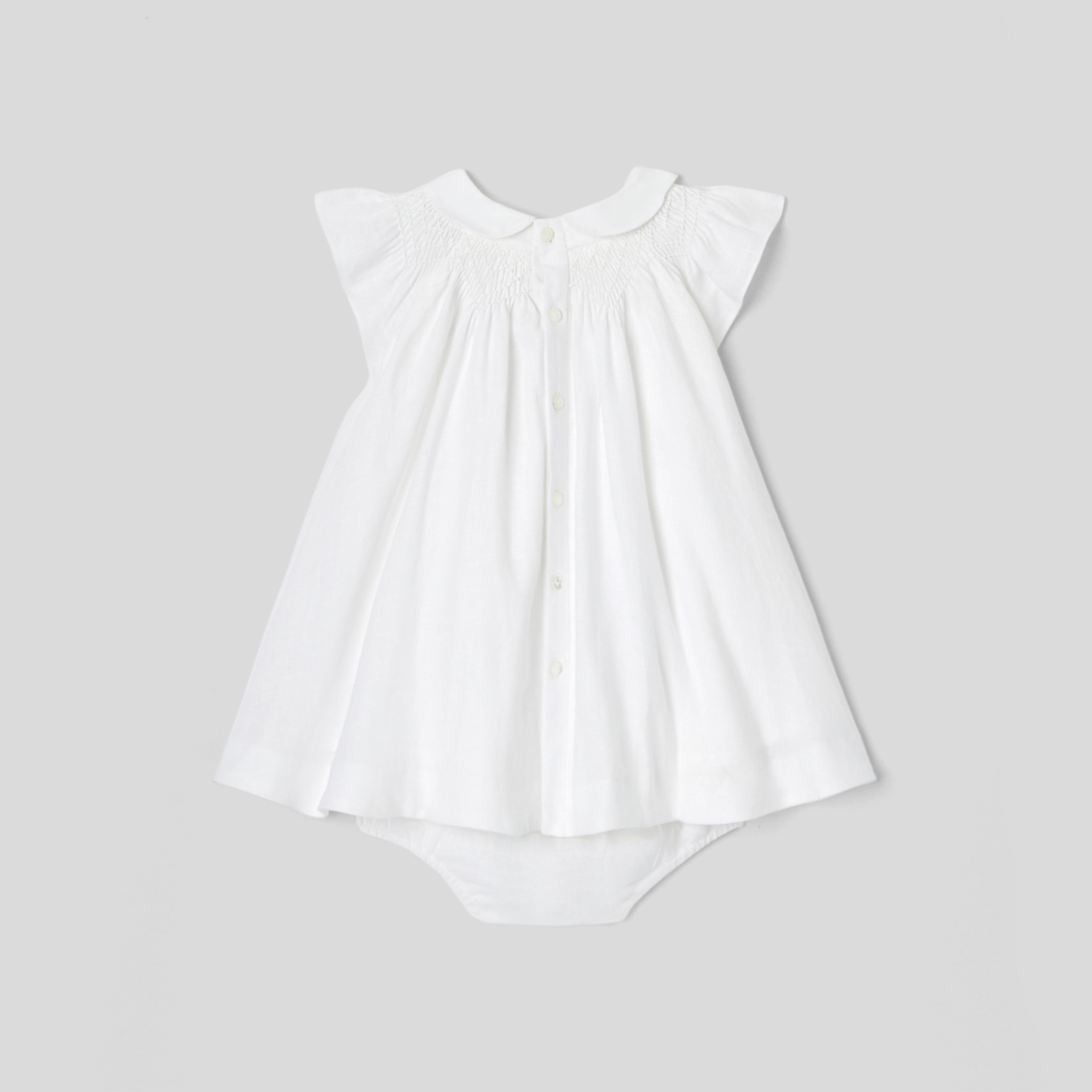 The baby girl formal dress focuses on a voluminous and sleek line. With ruffled raglan sleeves and a Peter pan collar, it is adorned with smocking at the neckline. Fully lined and paired with panties to finalize the outfit, pair it with the matching bolero on the day of the ceremony.