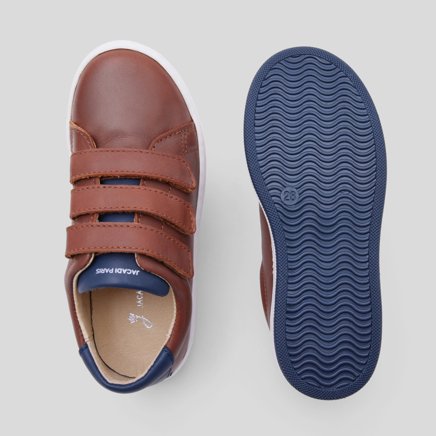 Designed to complement everyday outfits, these elegant tennis shoes coordinate easily with your little boy's wardrobe. Made with smooth leather with a colour block design and contrasting sole for a city-chic look, they slip on quickly thanks to velcro straps. - Contrasting heel piece - Wraparound velcro straps for a perfect fit - Made in Portugal - This model runs slightly large