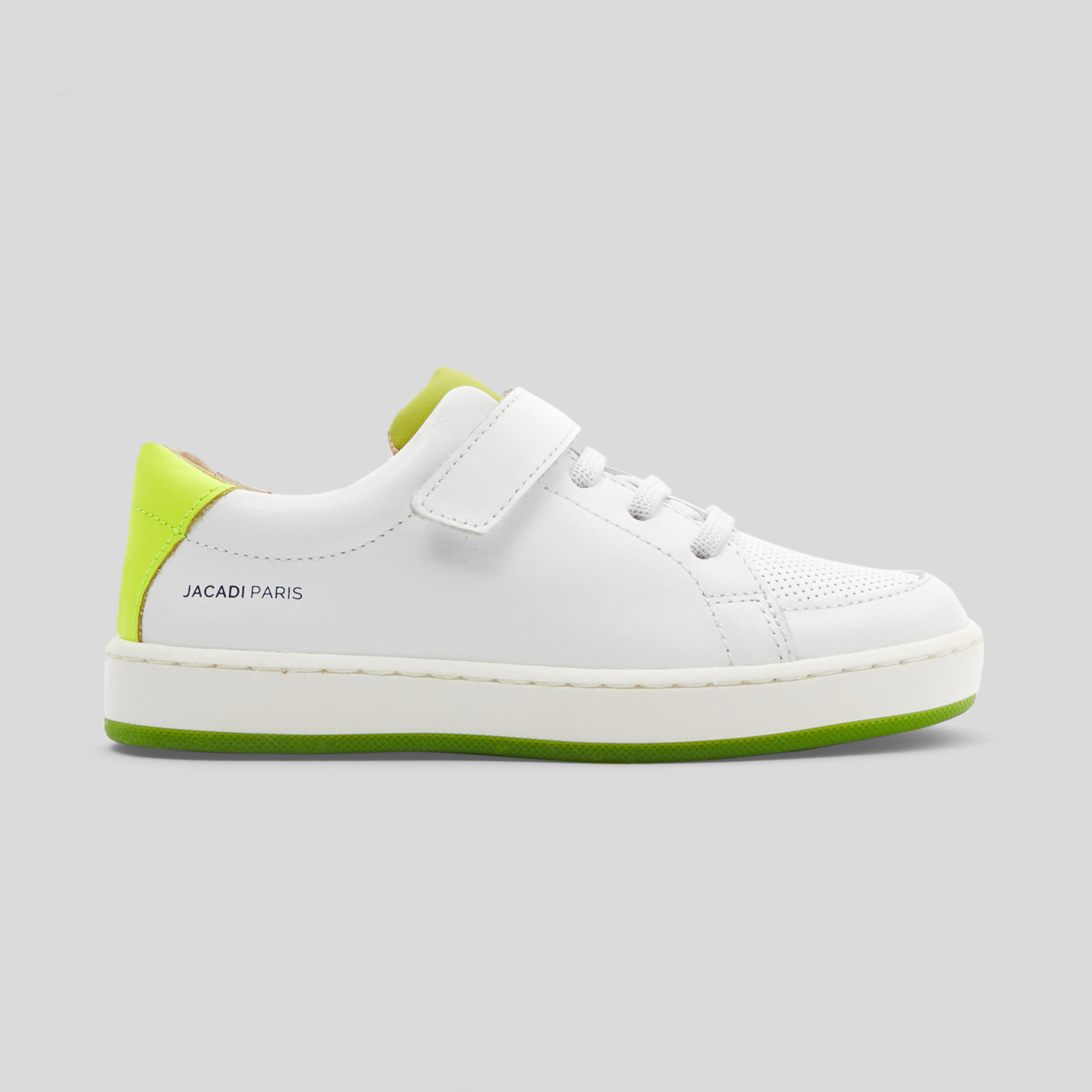 These boy low top sneakers are available in plain leather and modernized with a neon pop sole. Easy to slip on thanks to elasticated laces and an adjustable velcro strap, little boys will be able to easily match them with their favorite jeans.